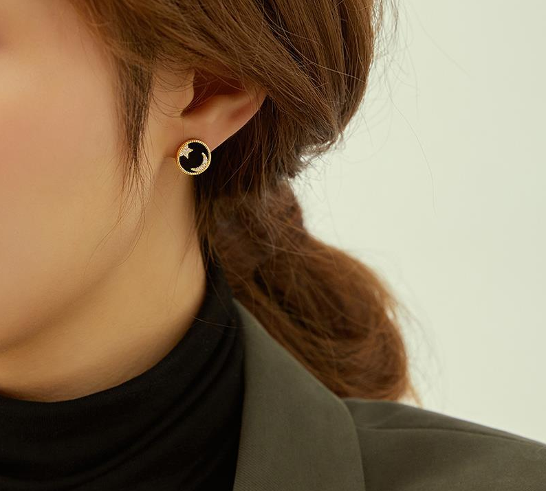 Сережки-гвоздики чорні Зірка та Місяць, сережки у лимонній позолоті, срібне покриття 925 проби
